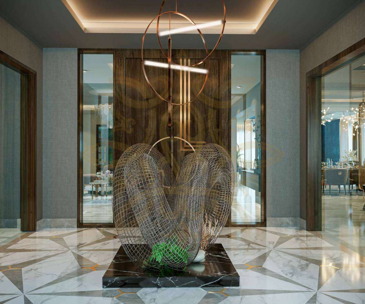 As you can see in the next image, metal inlays have been used masterfully to create a stunning visual impact in the design. The sleek, modern lines of the inlays enhance the floor’s luxurious marble pattern, flawlessly combining contemporary aesthetics with eternal grace. The polished brass accents introduce an element of glamour, while the geometric precision adds depth and dimension to the space. This combination of materials not only elevates the visual appeal but also highlights the sophisticated craftsmanship synonymous with MADS Creations’ attention to detail.
