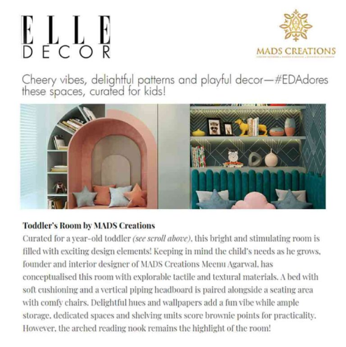 Meenu Agarwal, the founder and principal designer of MADS Creations has been recognized as India’s leading Interior Designers. She has been valued incessantly for her authentic designs made with uncompromised craftsmanship. Since the establishment of her design venture in 2002 – Meenu Agarwal has focused on the pivotal strength of innovation, an eye for intricate detailing and the understanding the client’s orientation for their space. A dedication to delivering a space that is artistically refined with global standards and handover work within the confined time has made Meenu Agarwal as a noteworthy name in the domain of interior design