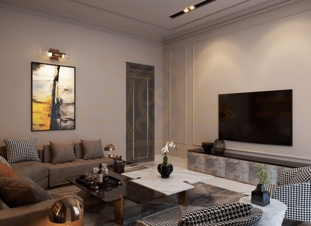 Next, let us take you through a cozy living space designed to envelop you in warmth and comfort. Plush, dark brown sofas invite you to sink in and unwind, while two accent chairs in a complementary colour provide additional seating for guests. The contrasting colour and design of the chairs prevent the space from getting into a monotonous tone, while their lavish comfort ensures you have ample seating. A strategically placed Television set allows you to catch up on your favourite shows, while the sleek TV Unit it offers a designated spot for displaying decorative items or placing your favourite books or magazines. This section really keeps your leisure space clutter-free and inviting. A custom-made coffee table with a smooth-finish white and black marble top offers a stylish surface for drinks, snacks or even a board game night.